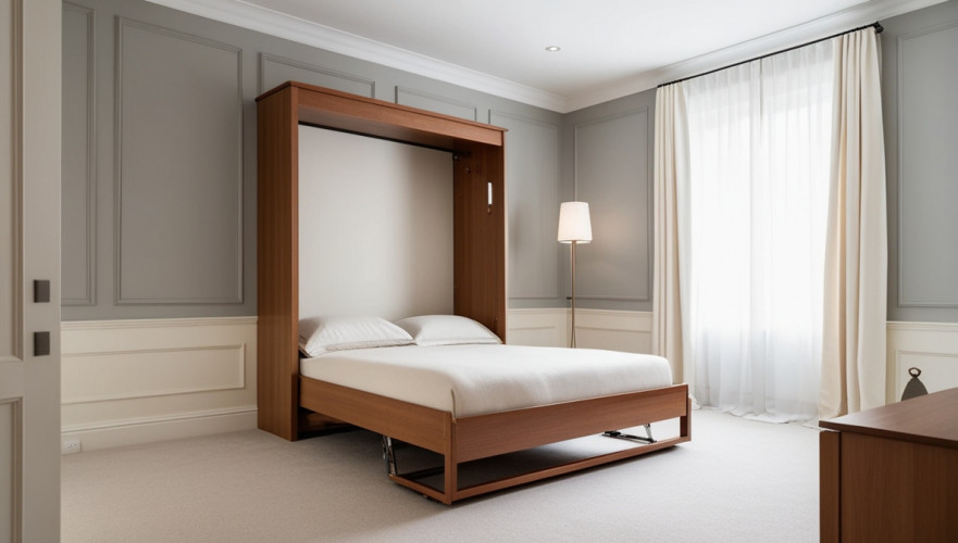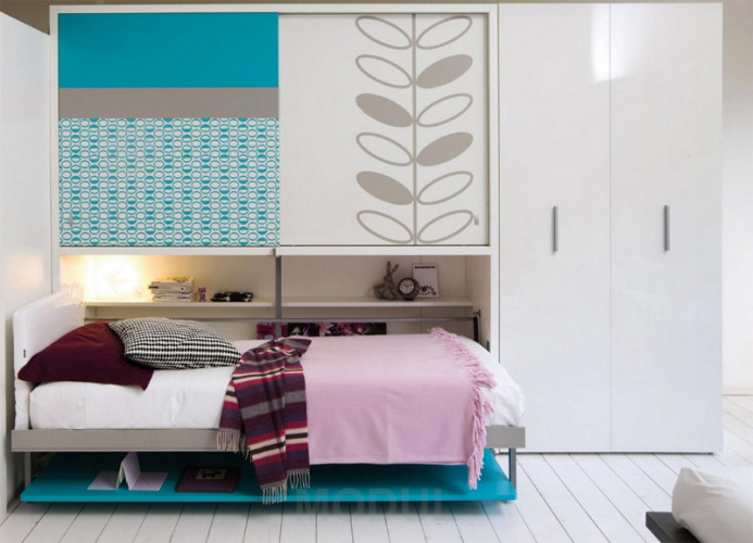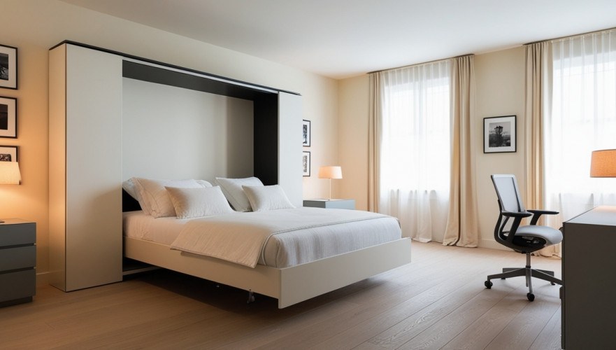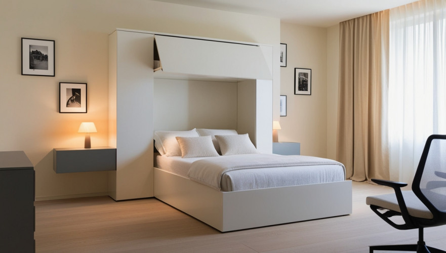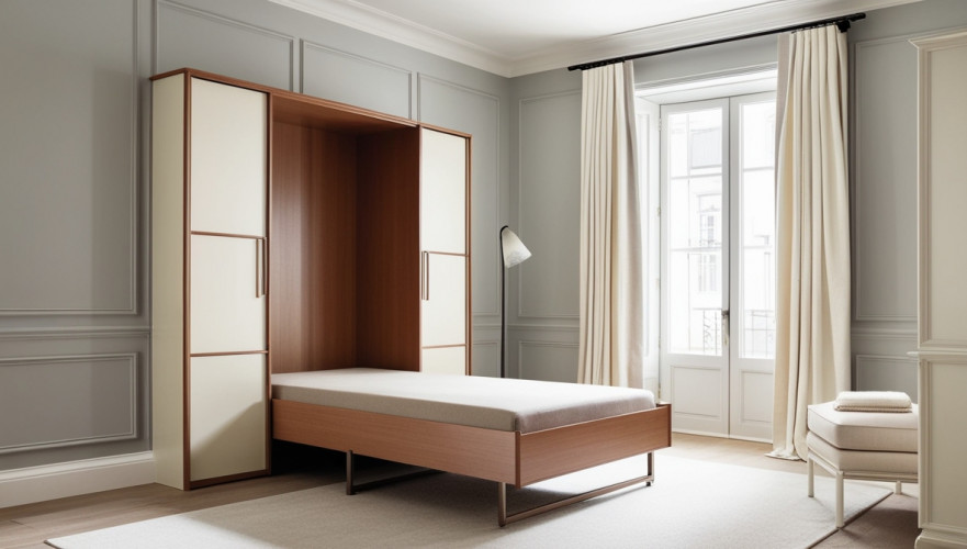 - Совмещение с шкафом: Откидная кровать может быть интегрирована в шкаф, обеспечивая дополнительное место хранения, что особенно полезно для небольших пространств.